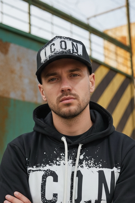 Il logo ICON a contrasto con effetto splatter domina il frontale, richiamando un’estetica street e industrial. Il cappuccio con coulisse regolabile e la tasca a marsupio aggiungono funzionalità e carattere, rendendola perfetta per outfit casual e metropolitani.