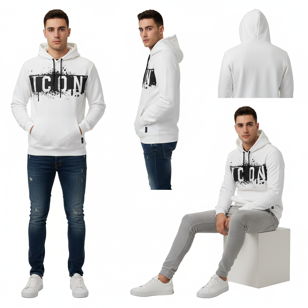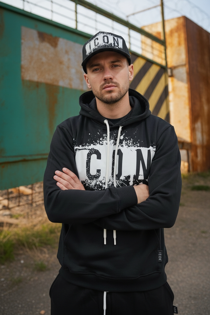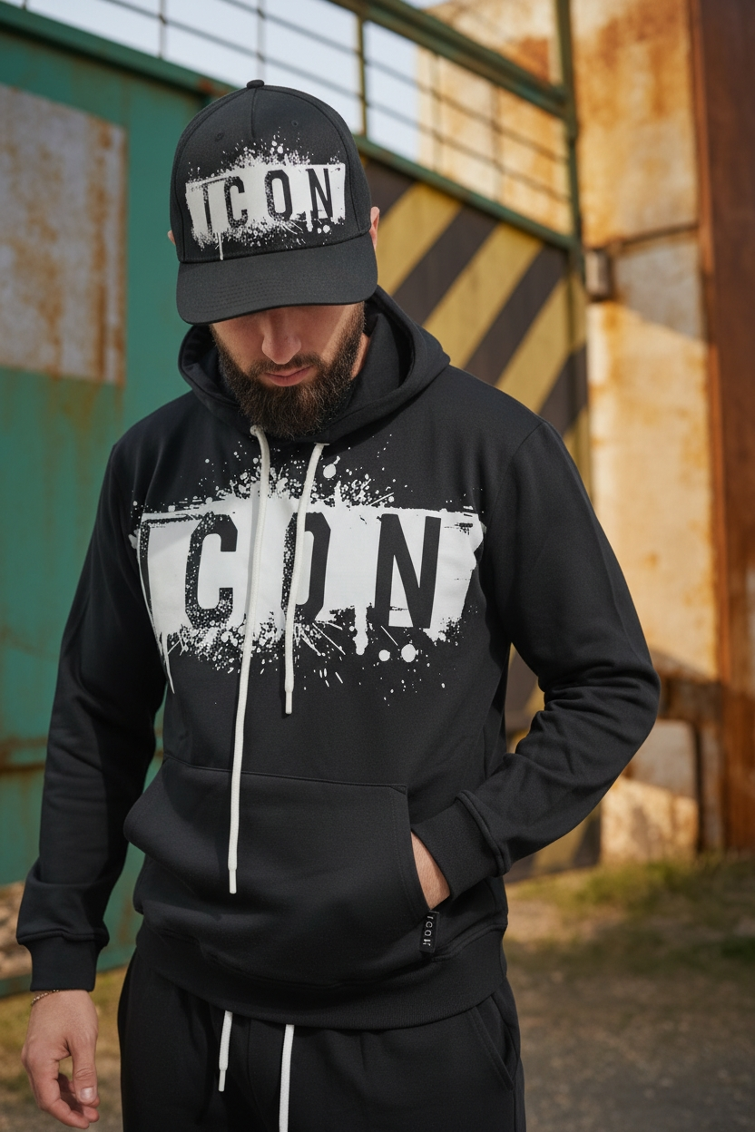 Il logo ICON a contrasto con effetto splatter domina il frontale, richiamando un’estetica street e industrial. Il cappuccio con coulisse regolabile e la tasca a marsupio aggiungono funzionalità e carattere, rendendola perfetta per outfit casual e metropolitani.